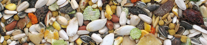 White Egyptian sunflower, seeds, Safflower seeds, Buckwheat, Dari Feterita (Dari Durra), Crushed corn, Flaked peas, Barley, Hulled oats, Wheat, Nectar Manitoba 4 mm, Peeled peanuts, Puffed corn, Crushed fava bean, White corn, Pumpkin seeds, Oyster shells, Apricot (Dried fruit), Banana chips (Dried fruit), Grapes (Dried fruit), Extruded corn, Rose hips, Swiss pine nuts, Brazil nuts, Hulled almonds.