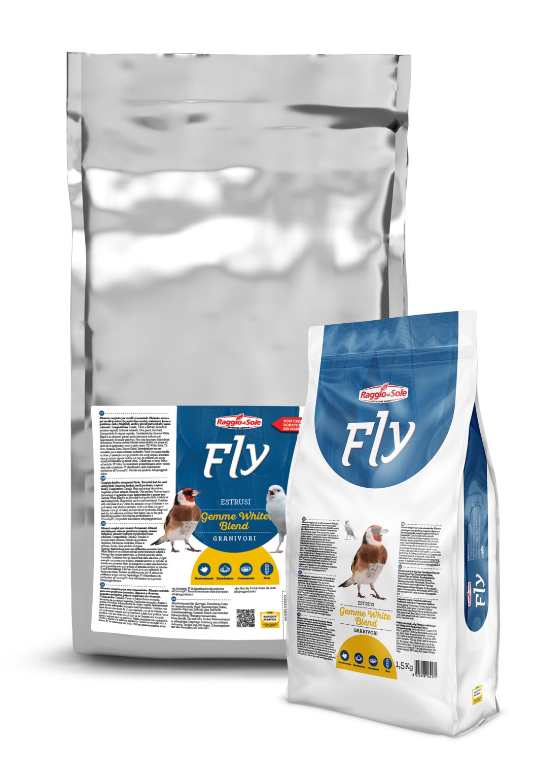 Gemme White Blend from the Raggio di Sole’s Fly line is a complete extruded – softballs – food for granivorous birds (fringillids, lipocoloured canaries, melanin, form and position birds, songbirds, exotics, small parakeets) without colourants.