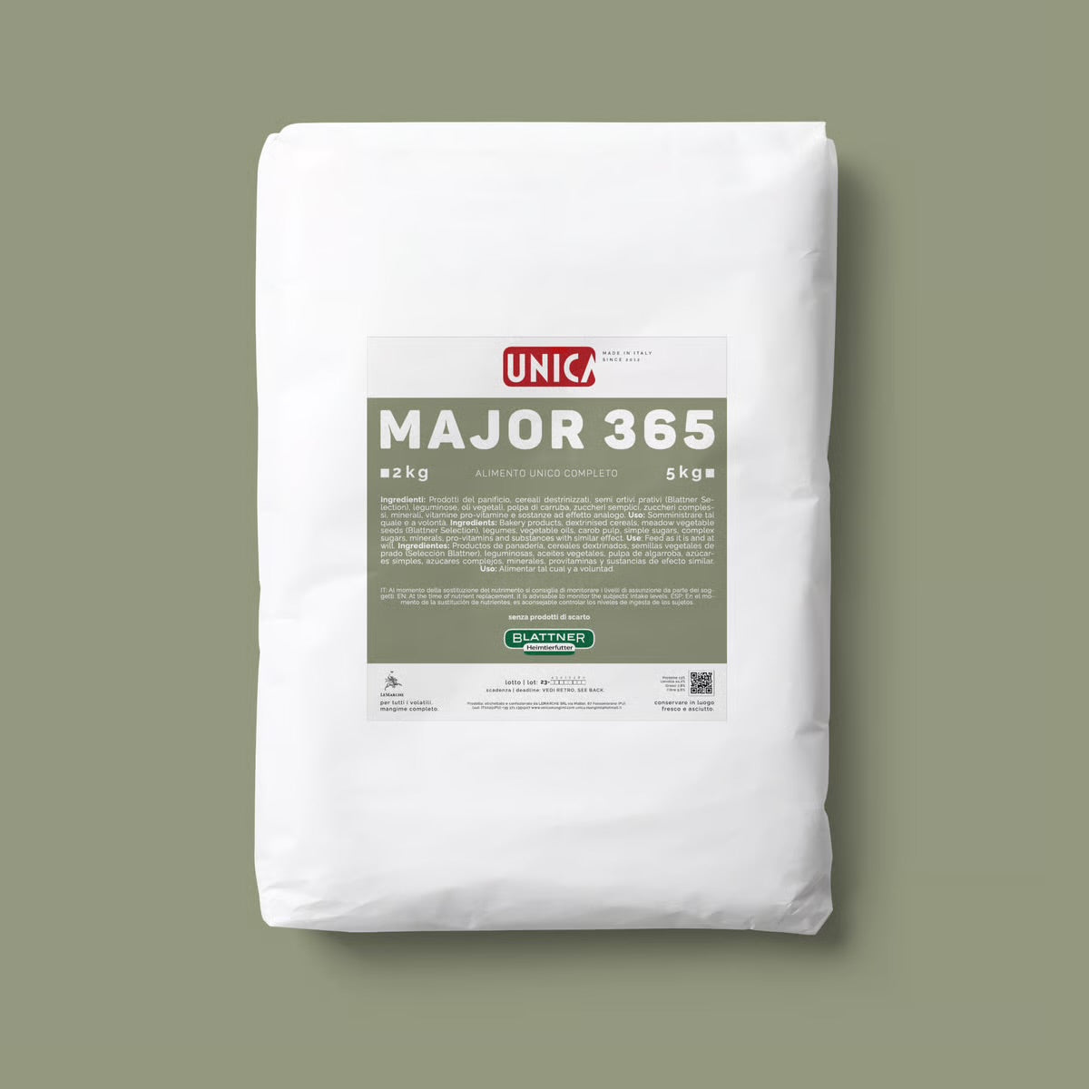 Major 365 is a soft white pate, low in protein and with excellent appetability specific for Major goldfinches. The product is the result of a solid and ancient collaboration between UNICA and BLATTNER and consists of a balanced and light pate, in the well-known UNICA philosophy, with a mixture of fresh seeds designed by BLATTNER specifically for major goldfins. This supplement can be made available 365 days a year because it is an excellent source of daily energy in all four seasons. Major 365 does not contain by-products, dyes, cross-linked animal fats, chemical preservatives and anti-fermentative agents!