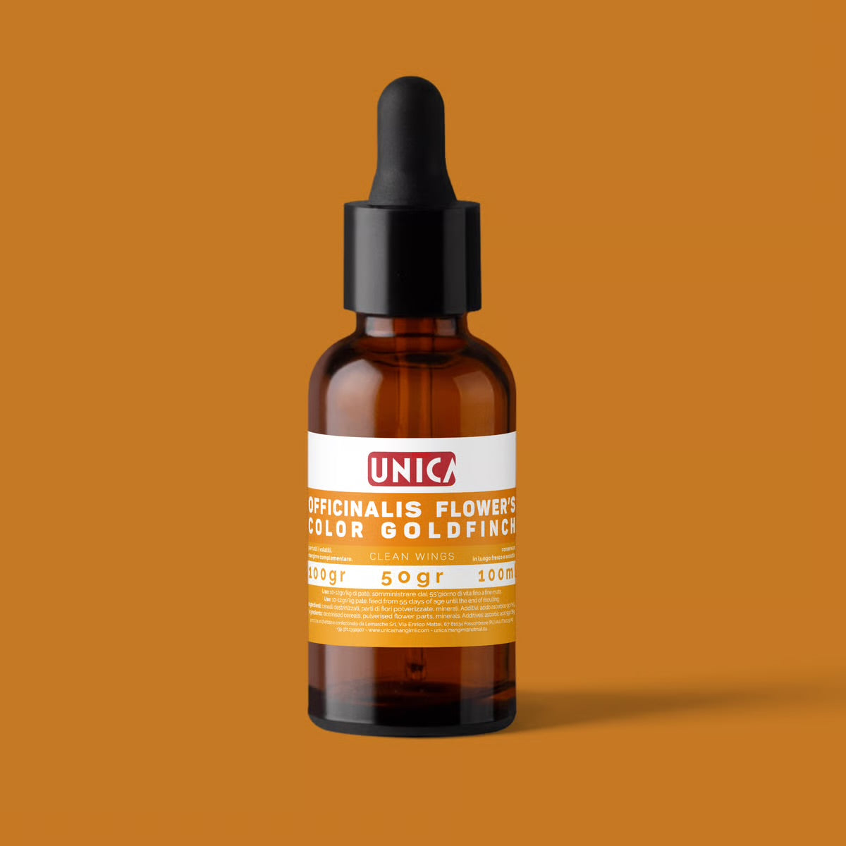 The water-soluble version (oleoresins) of Officinalis Flower Color Goldfinch is obtained from the flower mixture that makes up the classic powder version from which we extract only the active ingredients with pigmenting and antioxidant action, then we convert the resins from lipophile to water-soluble. It contains 25% of the purest lutein from tagete erecta and calendula officinalis. The product is added to the drinking water.