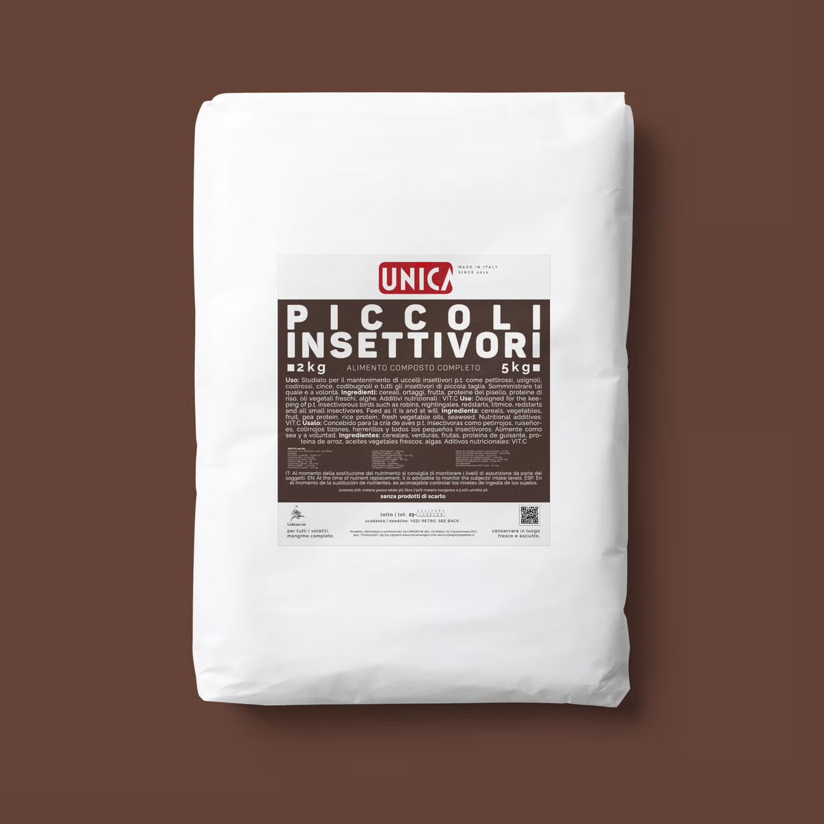 Food designed for the maintenance of small insectivorous birds such as robins, nightingales, red-tails, cince, codibugnoli, etc. Among its top quality ingredients are fermented pea proteins and algae strictly grown in Europe. Administer as is and at will as a daily food.